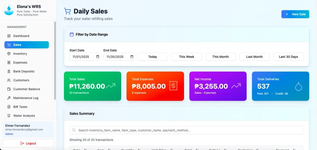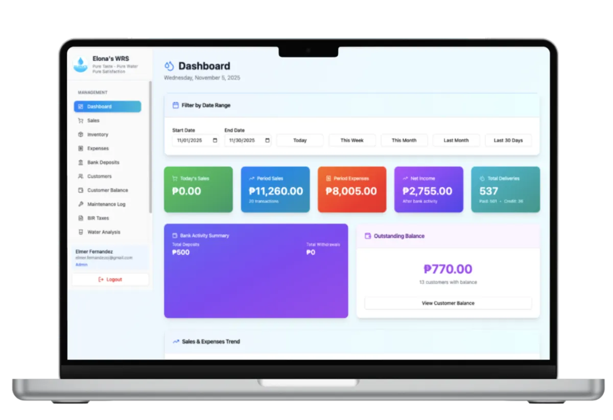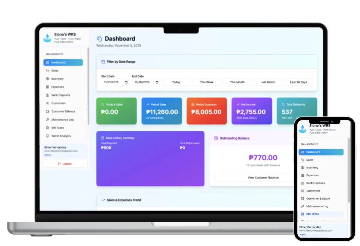 Primarily for water refilling stations, pero pwede rin sa ibang delivery-type or retail businesses na may sales, inventory, and expenses tracking needs πŸ’Ό
