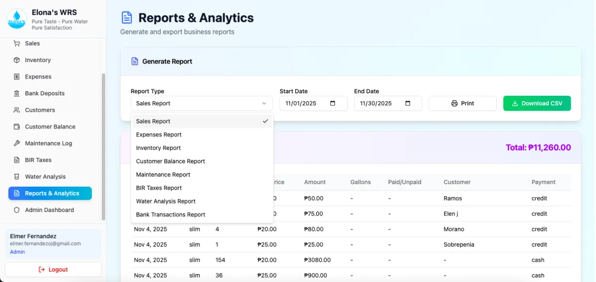 Generate printable reports (Sales, Expenses, Maintenance, etc.) and export as CSV anytime.